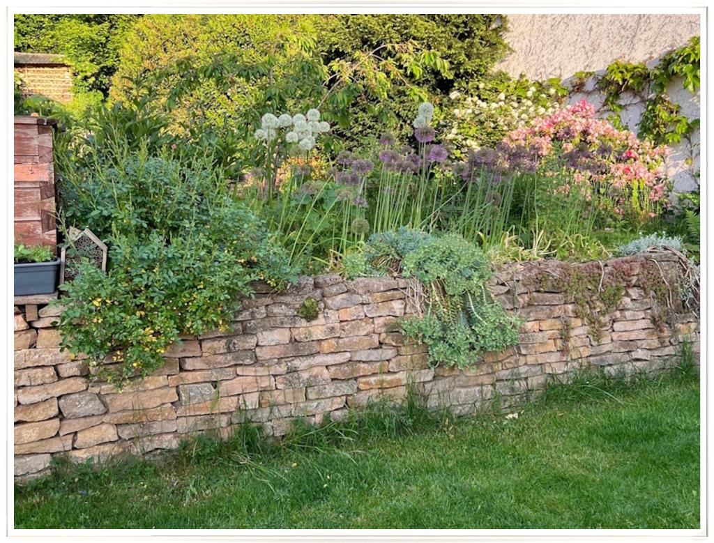 Natursteinmauern (an der Ostterrasse so gebaut, dass man eine Sitzfläche hat);