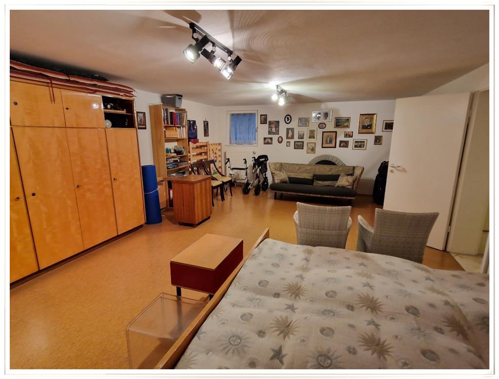 Im Untergeschoss gibt es einen 36 m² großen Hobbyraum, der in Wohnraumqualität ausgebaut wurde: ca. 2,30 m Raumhöhe, 12 cm starker Isolier-Estrich auf der Beton-Bodenplatte und mit wärmendem Korkboden als Bodenbelag; 2 Heizkörper an den Stirnseiten erwärmen den Raum bei Bedarf schnell. Die Nutzungsmöglichkeiten sind vielfältig: für Fitness/Wellness, als Atelier, Büro, privates Tanzstudio u.v.m. Aber auch der Leidenschaft zum Billardsport könnte hier gefrönt werden.
