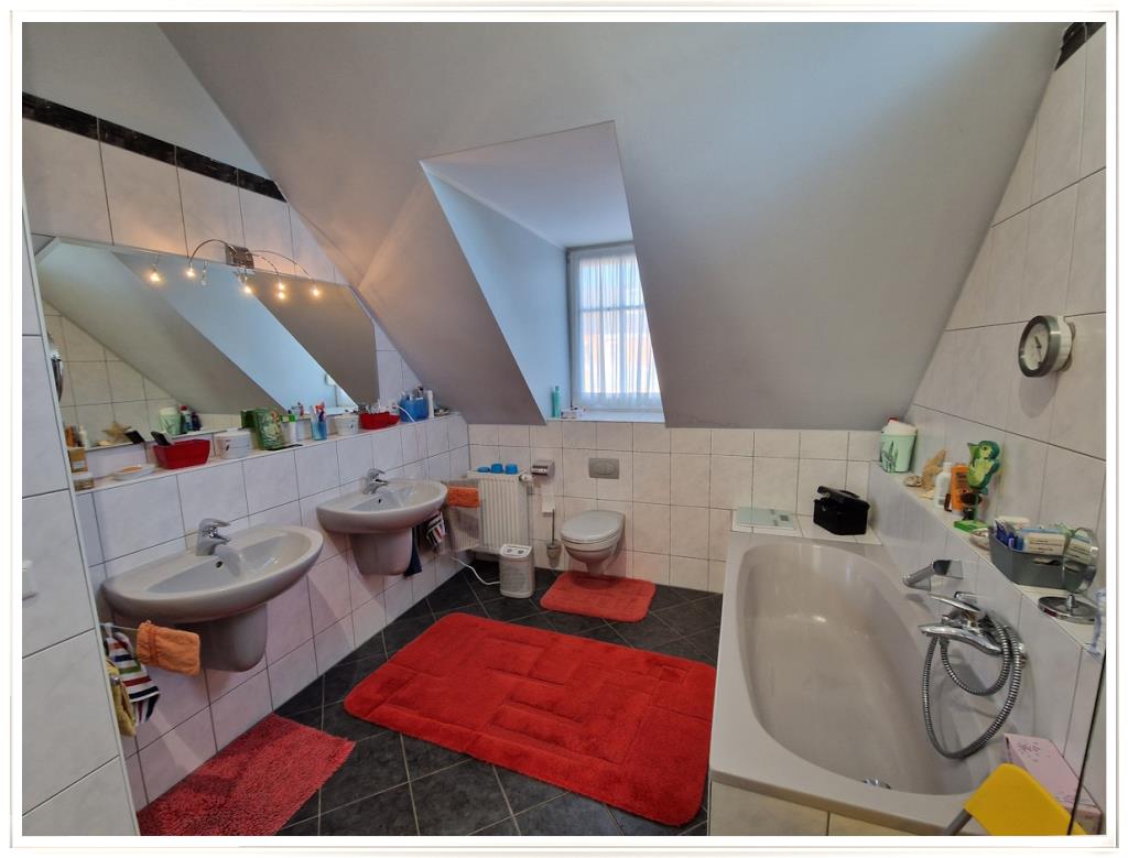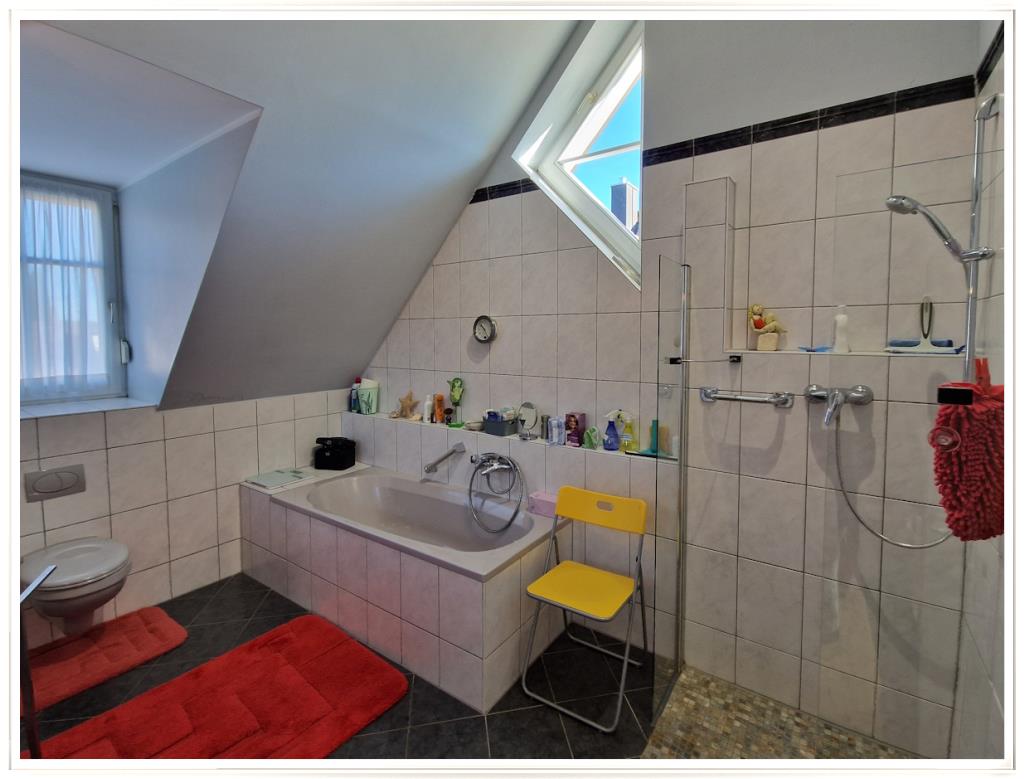 Im Dachgeschoss stehen 3 Schlafzimmer zur Verfügung und ein großes Tageslicht-Bad mit Wanne und Dusche. 2 Schlafzimmer haben Zugang zum Westbalkon.
