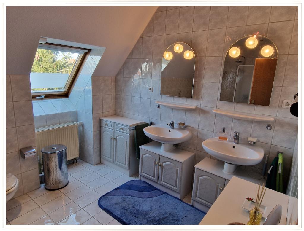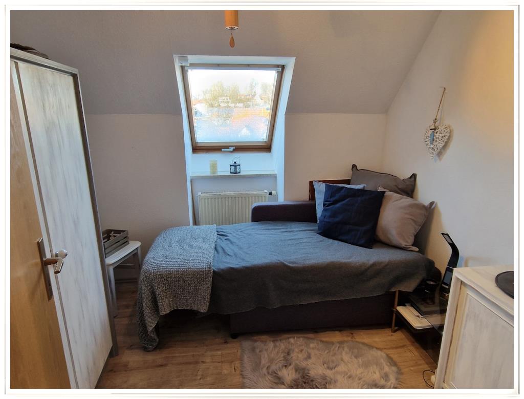 Im Dachgeschoss schließlich besticht das sehr geräumige Schlafzimmer (ca. 26 m²), das nach Osten hin ausgerichtet ist: ein Traum, denn der Blick geht übers unbebaute freie Feld, so dass Sie die Morgensonne genießen können, wann immer der Himmel entsprechend klar ist. Neben diesem großen Zimmer gibt es ein großes Tageslichtbad mit Wanne und Dusche sowie 2 Waschbecken, ein kleineres Zimmer und eine über