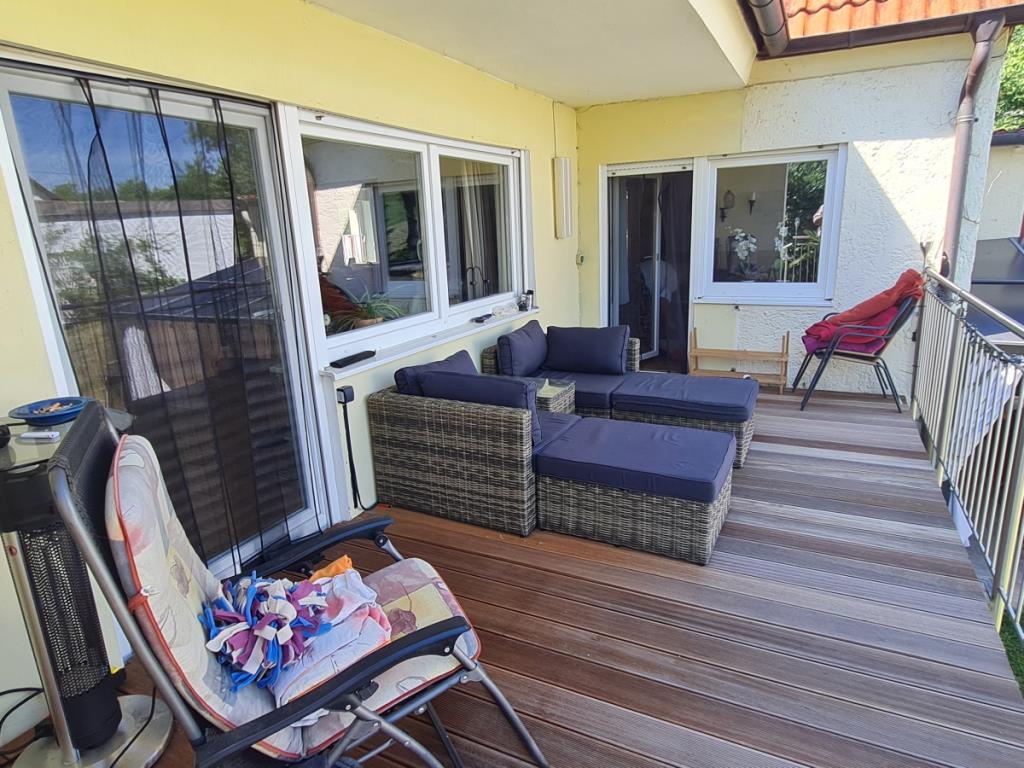 Knapp 30 m² großes Wohnzimmer mit Ausgang zum 18 m² großen terrassenartigen Balkon, mit Freitreppe zum Garten;